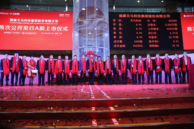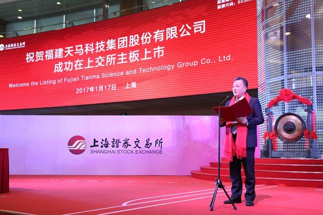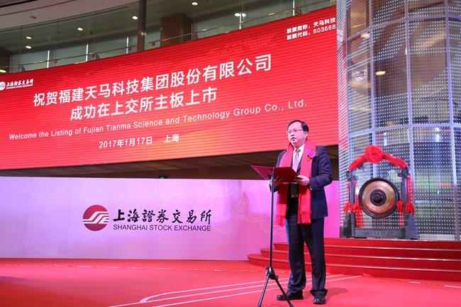 天馬科技訊 1月17日,福建天馬科技集團股份有限公司(證券簡稱“天馬科技”,證券代碼603668)首次公開發(fā)行A股上市儀式在上海證券交易所隆重舉行。天馬科技陳慶堂董事長及福建省福清市人民政府市長張帆,福建省泉州市泉港區(qū)人民政府區(qū)長顏朝暉,海通證券總裁瞿秋平,建設銀行福建省分行副行長王東標,福清市第十六屆人大常委會主任王德玉,政協(xié)泉州市泉港區(qū)第三屆委員會主席連啟明,福清市市委常委、統(tǒng)戰(zhàn)部部長陳存楓,泉州市泉港區(qū)常委、統(tǒng)戰(zhàn)部部長陳龍津,集團董監(jiān)高,行業(yè)協(xié)會、金融機構、客戶代表及上市中介機構代表等出席上市儀式。陳慶堂董事長和福清市張帆市長、上交所領導共同敲響開市銅鑼,標志著特種水產配合飼料領軍企業(yè)、中國飼料工業(yè)協(xié)會副會長單位——天馬科技正式登陸A股市場。