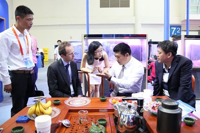 上圖為陳慶堂董事長向于康震副部長,農(nóng)業(yè)部原副部長、中國飼料工業(yè)協(xié)會顧問高鴻賓等領(lǐng)導(dǎo)介紹天馬科技產(chǎn)品及相關(guān)水產(chǎn)品