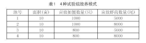 (4)放養(yǎng)模式:至3月12日長江1號扣蟹全部放齊,5月20日南美白對蝦苗放齊。設(shè)置4種不同放養(yǎng)密度進(jìn)行試驗(yàn)研究,詳見表1。