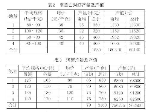 (2)產(chǎn)值:四個(gè)塘口南美白對蝦和河蟹的總產(chǎn)值362640元。